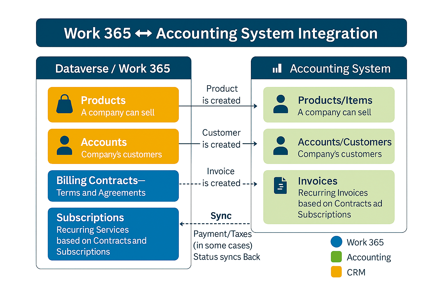 - Accounts, Products, and Invoices are integrated between Work 365 and the Accounting System.