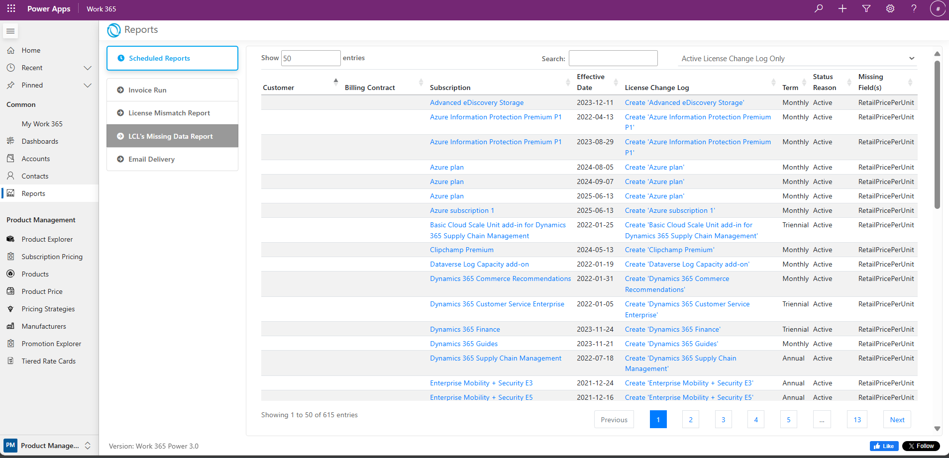 This report refers to license change logs where the associated subscriptions are missing data. The report details on the right side which fields are missing data.