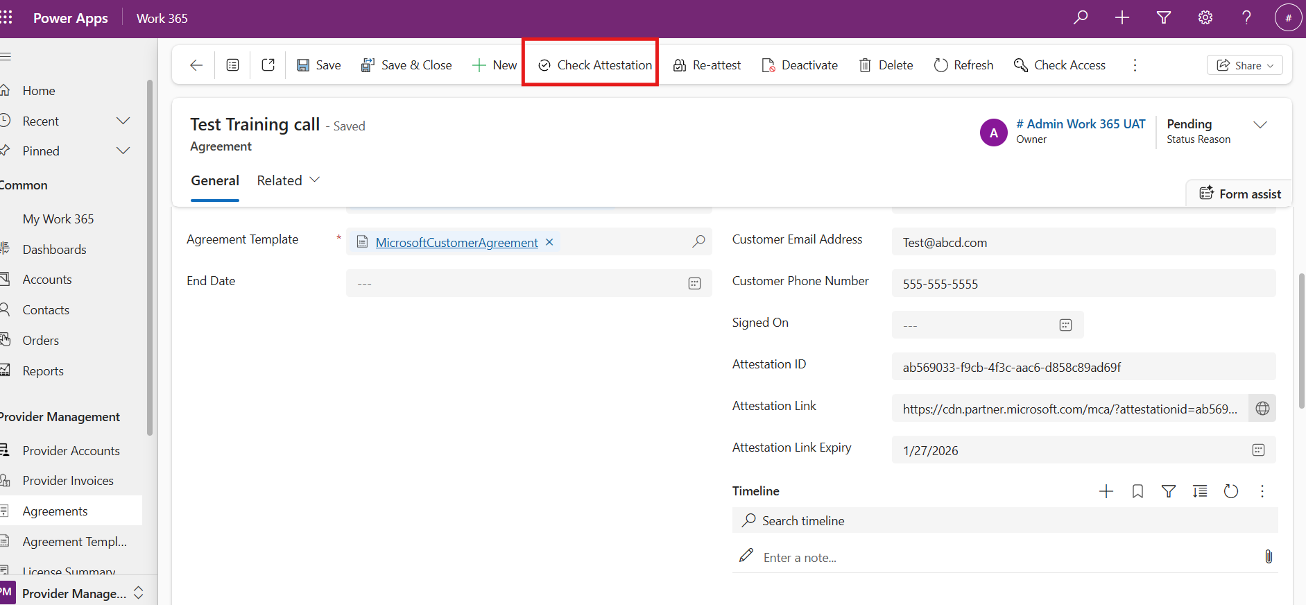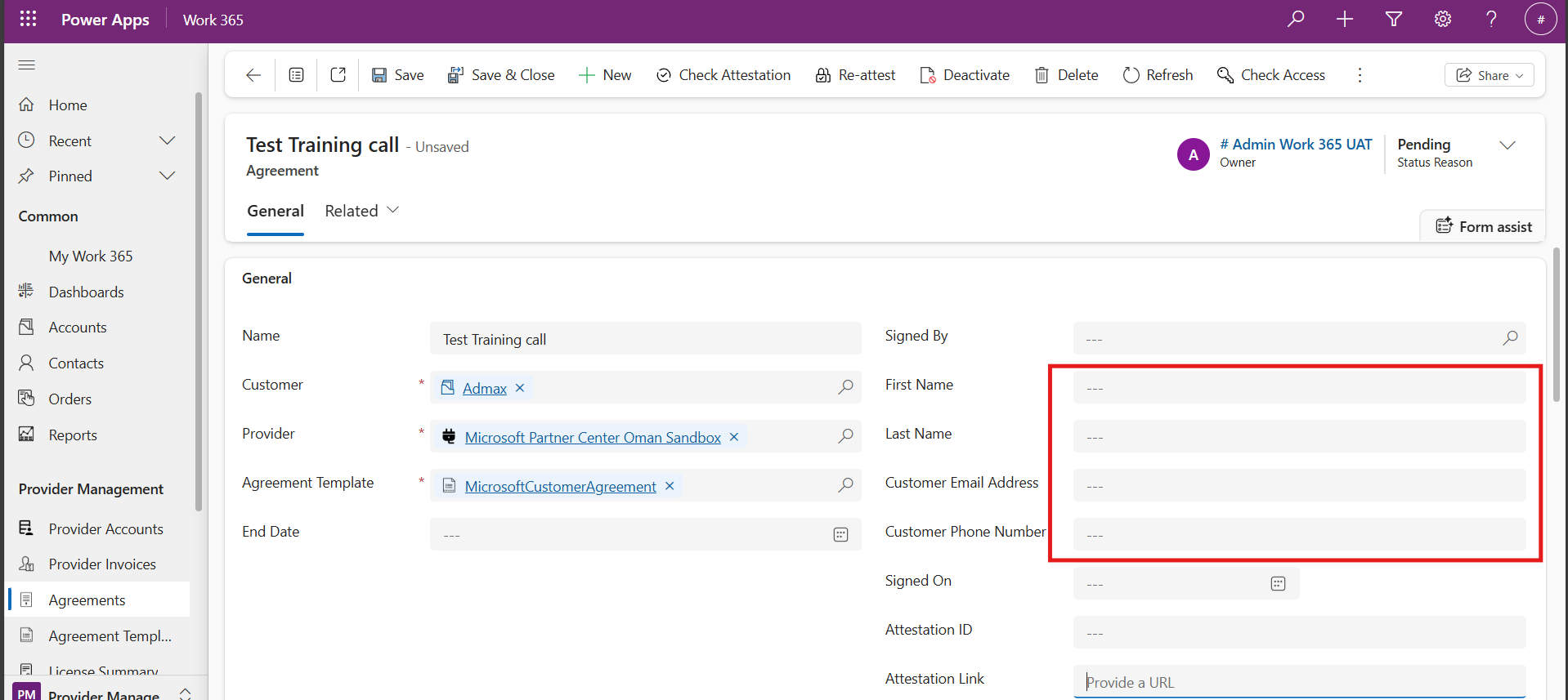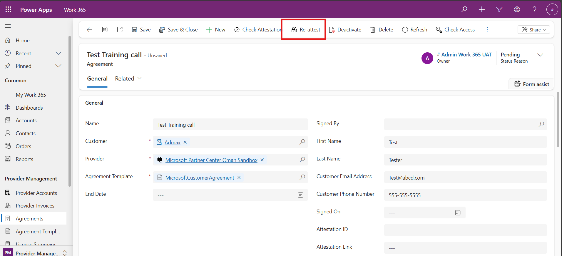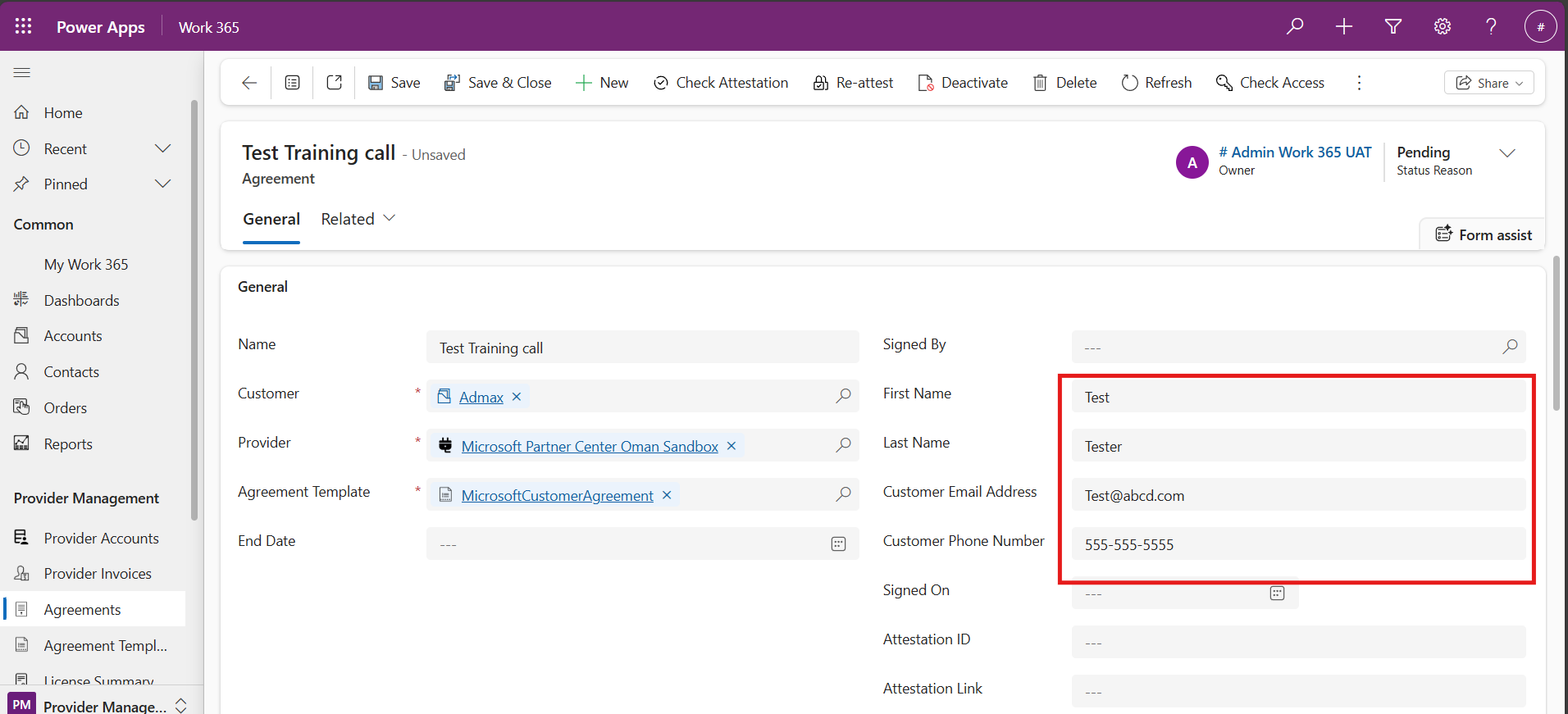 When an Agreement Templates is in an Active State, syncing Provider Accounts from an Automatic Provider to Work 365 will create Agreements of that Provider in that Account. These Agreements will be created with a Pending Status Reason.