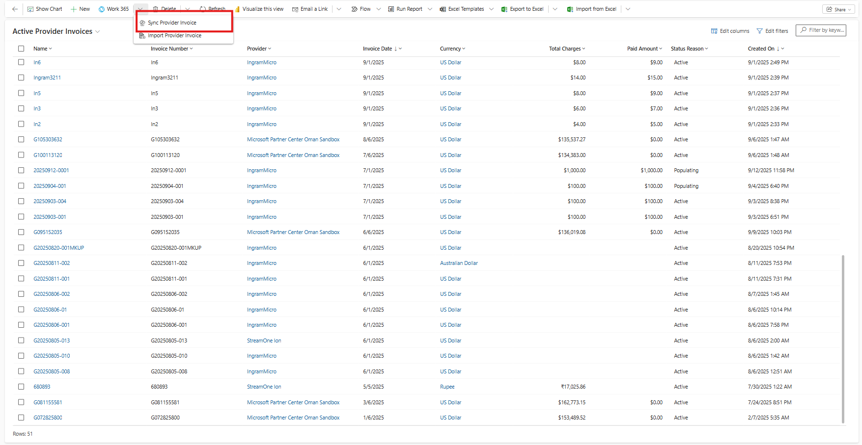 - A list of invoices from the provider will populate.