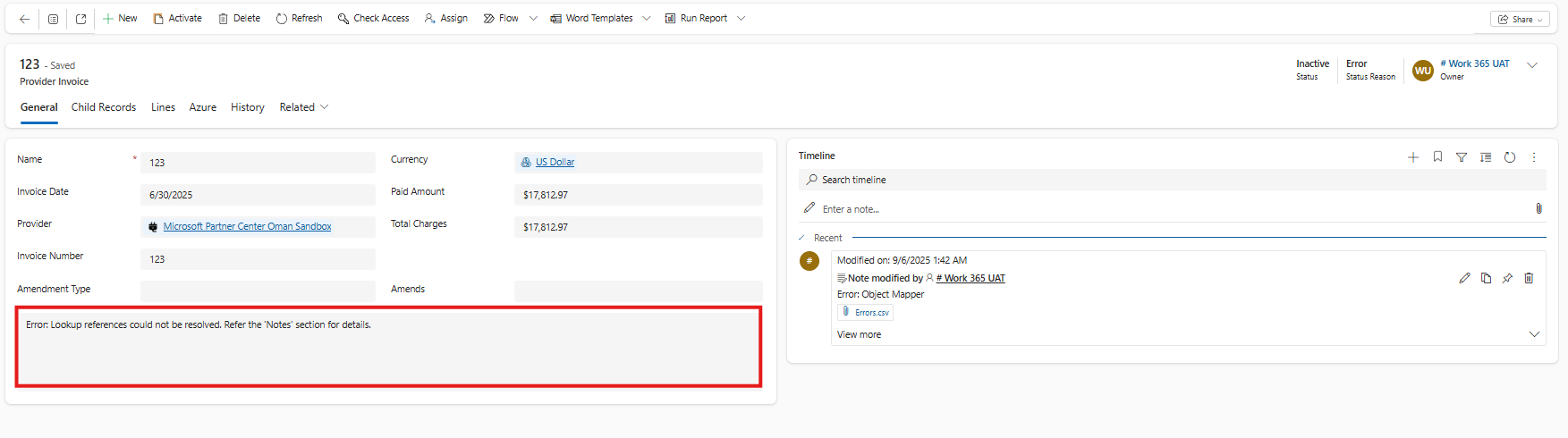 - The Provider Invoice record will show an error message indicating the missing references.